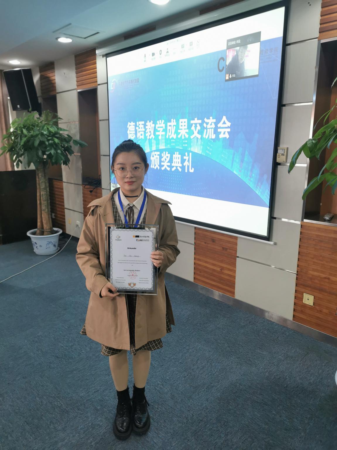 2020年10月28日,全国中德合作办学高校联盟举办的第一届非德语专业学生的德语演讲比赛在浙江科技学院举行。2019级国际教育交流学院中德班陈姝彤同学代表我院参赛并获得“杰出演讲者”奖项。