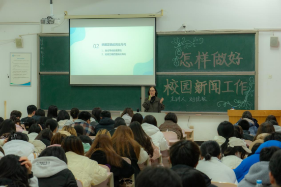 刘德敏老师分别从新闻工作者的素养、如何把握正确的舆论导向以及新闻报道的类型与写作三个方面讲述了怎样做好校园新闻工作。