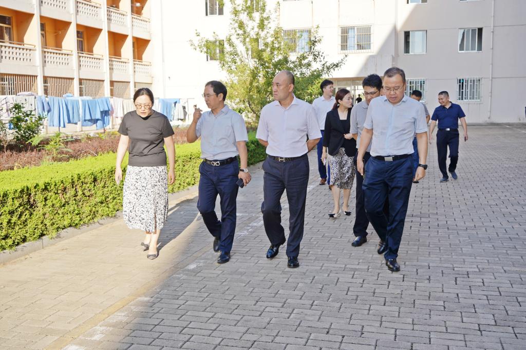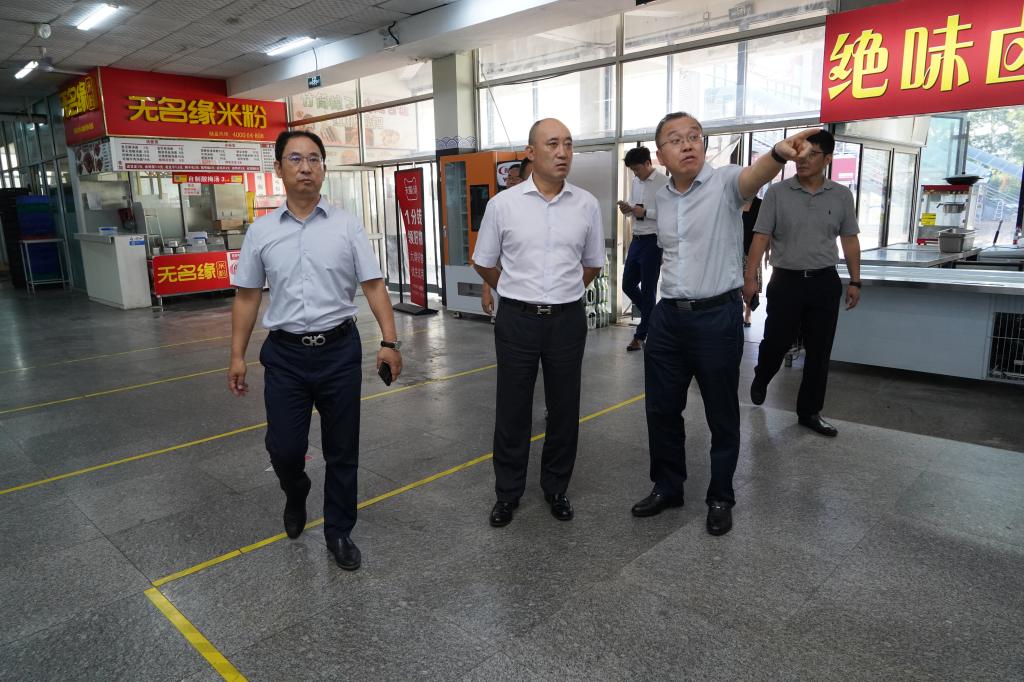 辛军董事长一行在校领导的陪同下先后来到新建宿舍楼、学生食堂等考察生活服务设施建设,详细了解了新建宿舍楼的投入使用和食堂改造情况。同时,对校园环境以及安全管理给予了现场指导。