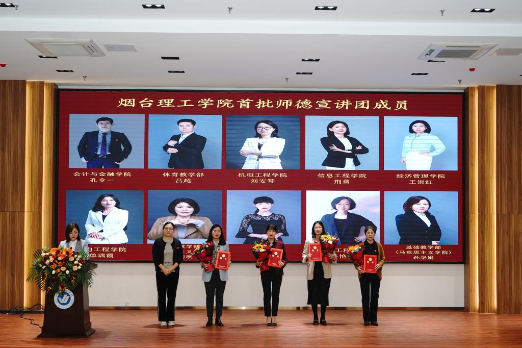 会上,副校长苏春景宣布烟台理工学院师德宣讲团成立并宣读了《烟台理工学院关于成立校级师德宣讲团的通知》。党委书记盛国军为师德宣讲团团长孔令一授旗,校领导依次为烟台理工学院首批宣讲团成员代表颁发聘书。