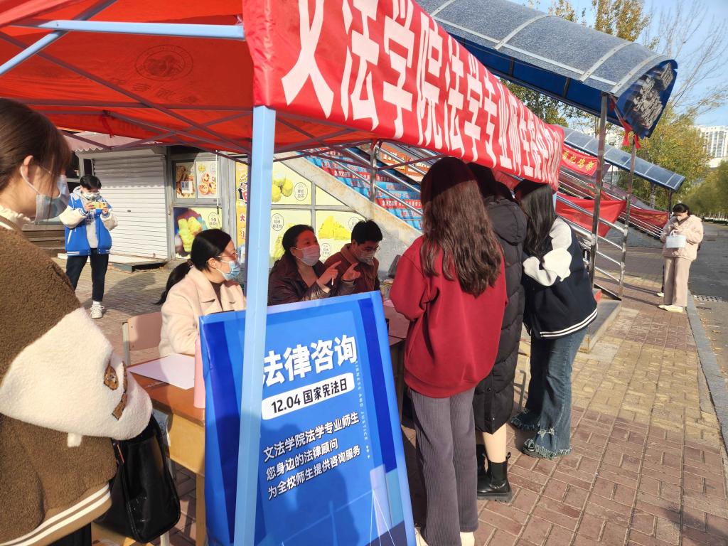 在“12.4”第九个国家宪法日来临之际,文法学院以兼职律师、仲裁员为主的法学专业师资队伍和普法协会法学学生于11月19日上午在校园三餐门前面向全校师生举办了“与宪同行”为主题的法律咨询服务活动。