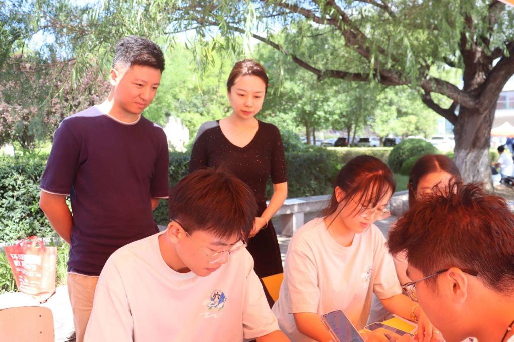 在迎新工作开展的过程中,外国语学院院长刘白玉、党总支副书记赵蓓、团总支书记董瀚文和辅导员郭亚军、徐爽、纪俞舟也来到新生报到处,指导新生工作。为了全面了解新生的情况与需求,志愿者们也在迎新过程中一直与新生班主任保持联系,遇到问题及时解决。外国语学院的师生们都在为迎新工作而忙碌着。